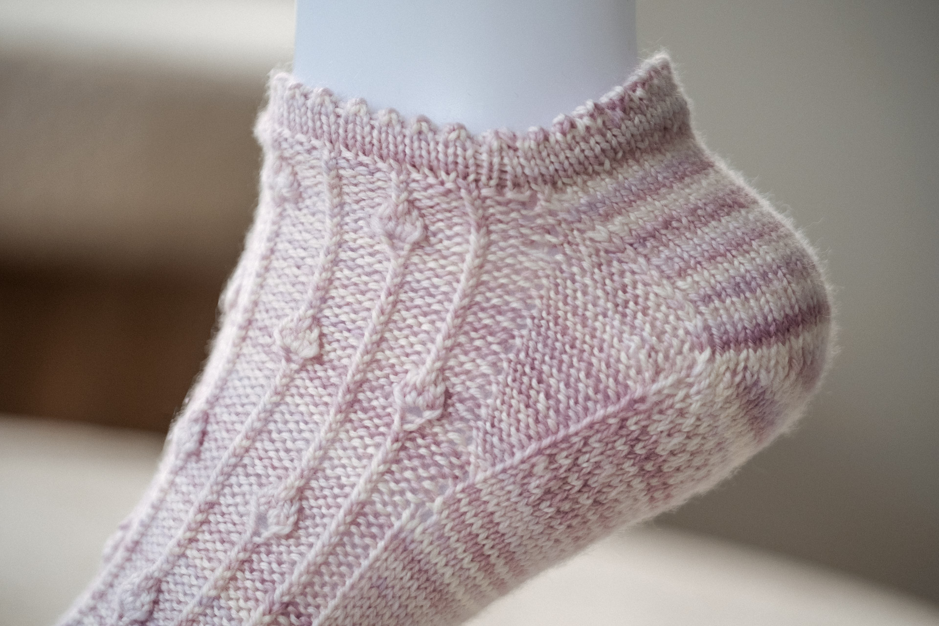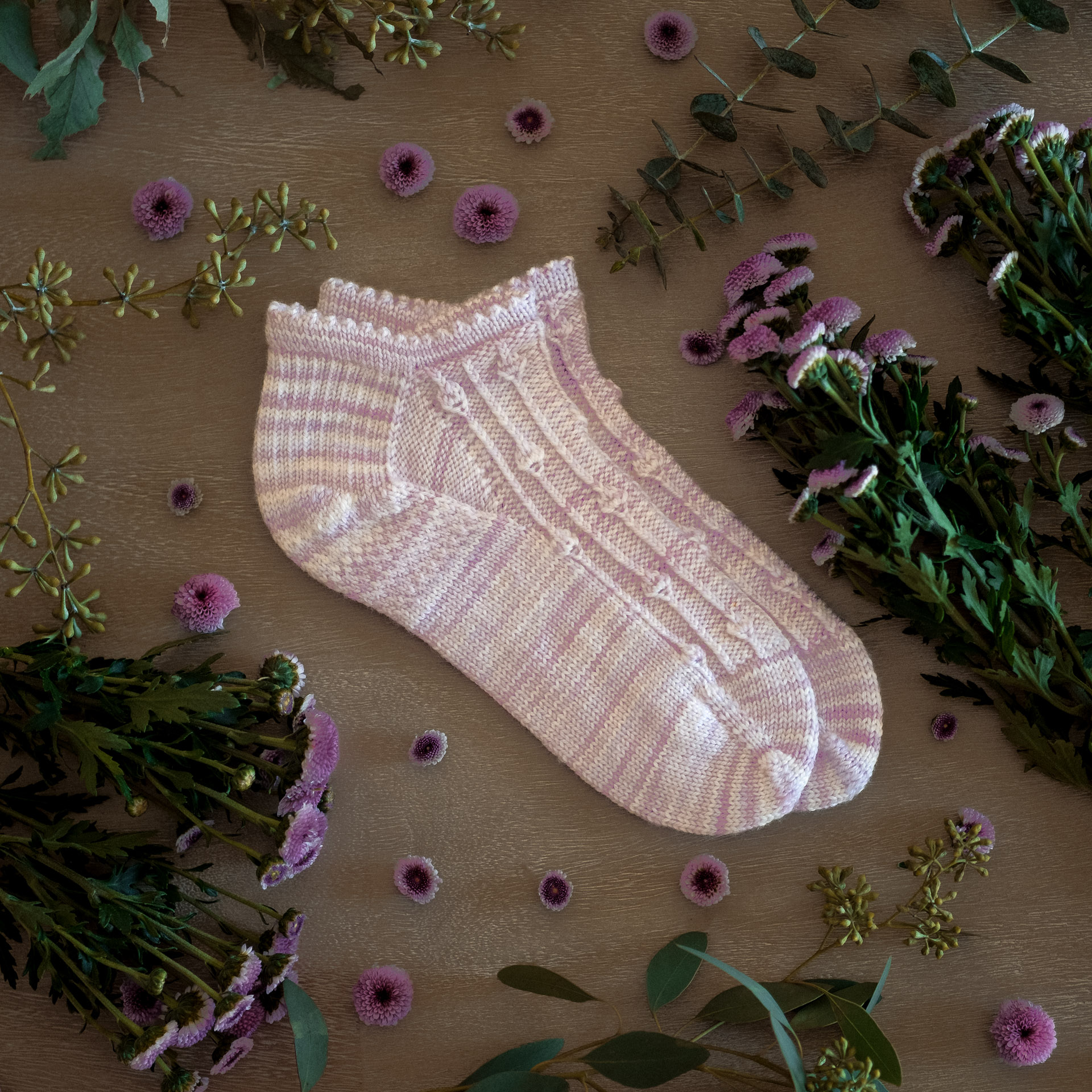 The samples shown here were knitted with our Fondant Sincere Sock (anklet version) and Sage Sincere Sock (mid-length version). You’ll need one skein of Sincere Sock yarn to knit any of the three sizes of the Rosebud socks.